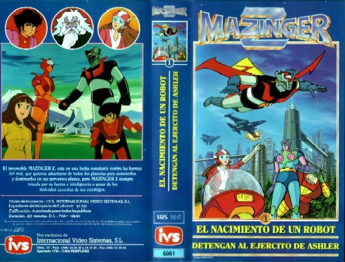Carátula de la primera cinta de IVS de los años 90 Todos los que alguna vez hemos hecho radio sabemos lo importante que es la voz. Si nos cambiaran la voz no seríamos nosotros, es como si nos cambiaran el rostro. Algo así nos pasó al escuchar esos capítulos de Mazinger Z en doblaje latino. Cómo doblarla entera hubiera sido una importante inversión para un canal de televisión que empezaba, se decidieron por utilizar una de las versiones latinas dobladas en hispanoamérica. También se emitieron algunos capítulos del Gran Mazinger cuando finalizó la serie. No sería el único en España que programaría el video para poder grabar estos capítulos. En septiembre de 1997, TELE 5 volvió a emitir toda la serie completa, también en un horario muy madrugador. Entre los años 1997 - 1999 algunos canales autonómicos emitieron la serie completa. CANAL SUR llegó a emitir incluso episodios de Grendizer con el doblaje latino. El segundo canal de TVC "CANAL 33" emitió en 1999 la serie completa. Era muy gracioso escuchar como el Dr Infierno insultaba en catalán al Barón Ashler y de decía ¡Baró Ashura és vostè un imbècil! arto de él. El CANAL 33 la emitió dos veces, muy probablemente para amortizar el coste del doblaje en catalán, el cual estaba muy bien conseguido. También entre los años 1998-1999 aparecieron en Valencia ciudad, tiendas que se dedicaban exclusivamente al merchandising de muchas series de tv (incluida Mazinger Z). Yo pude adquirir algunos objetos en estas tiendas. También en estos años aparecieron en los grandes almacenes las películas inéditas de Mazinger Z (finales de los años 70) en Vhs y dobladas en español con sonido estéreo.